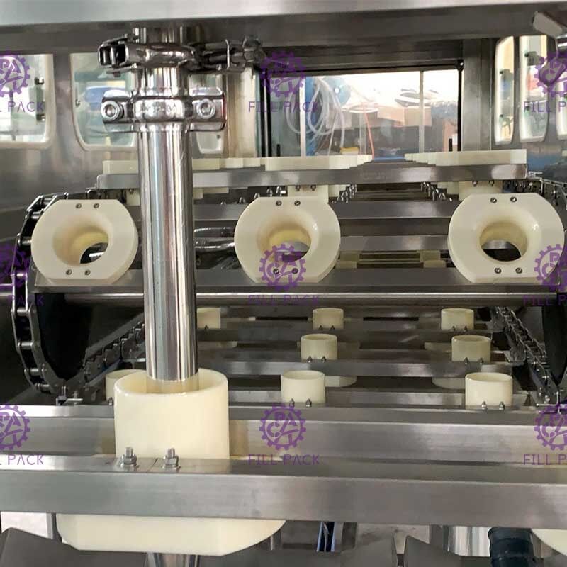 洗浄されたバケツはチェーンの動きに合わせて90度回転し、空のバケツはバケツシリンダーによってバケツベースから引き出され、バケツラックで下向きに回転し、次にプッシュシリンダーによってバケツが逆さまになり、空のバケツが充填機コンベアベルトに置かれ、充填を待ちます。