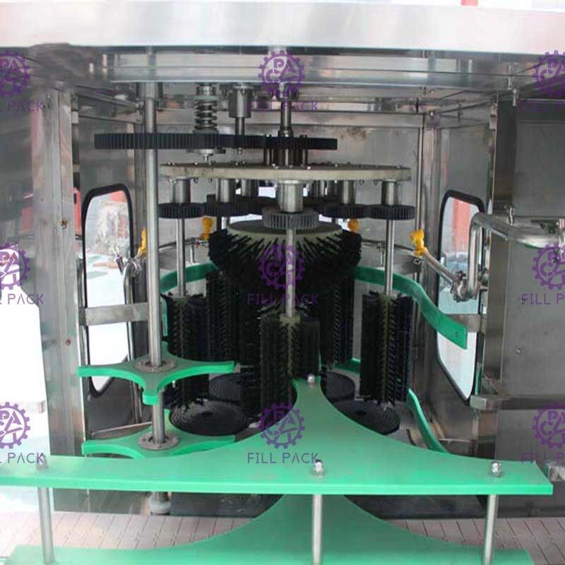 機械は水漏れを防ぐために完全にブロックされており、ガロンボトルが洗浄位置に送られると、シリンダーが内部の3本のボトルを停止し、ブラシと固定バーで固定され、水がポンプで汲み上げられてボトル本体に噴射され、ボトルはブラシとともに回転します。ボトルはブラシと水機能によって洗浄されます。