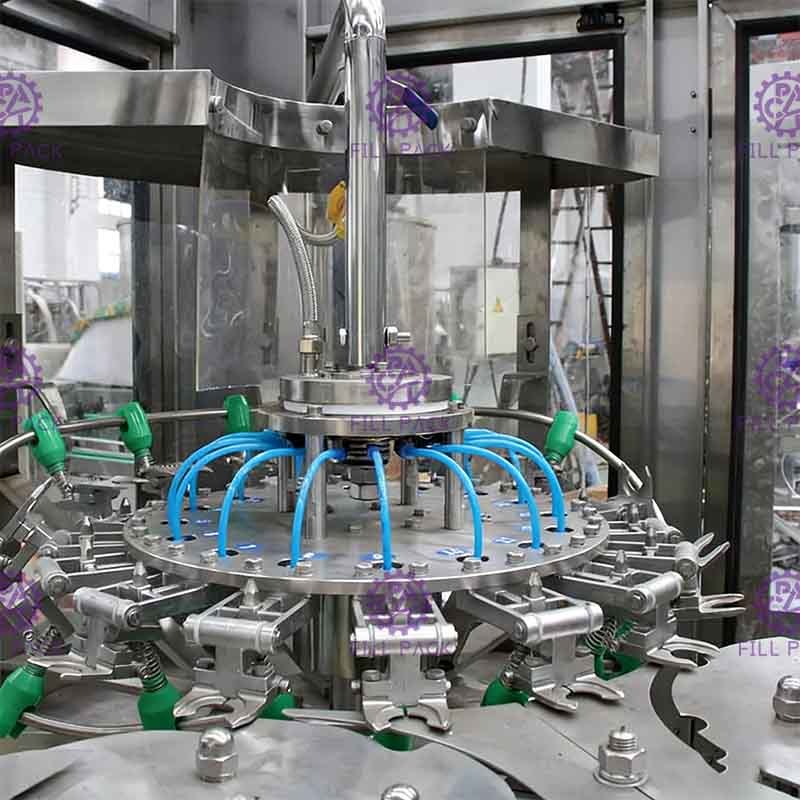 6) 充填バルブは、ボトルネックに移動して接触すると開き、充填が完了すると、充填バルブが上方に移動してボトルネックから離れます。